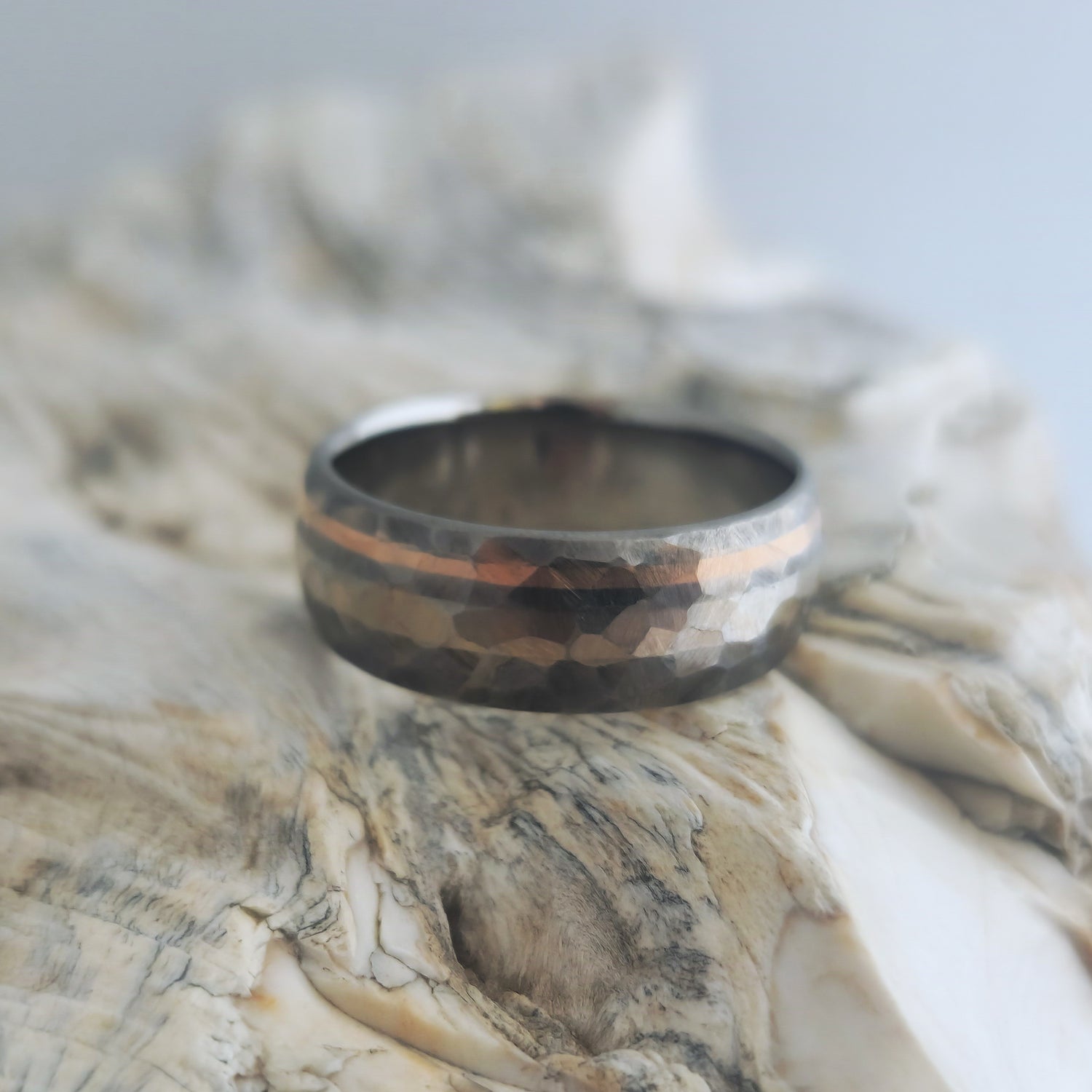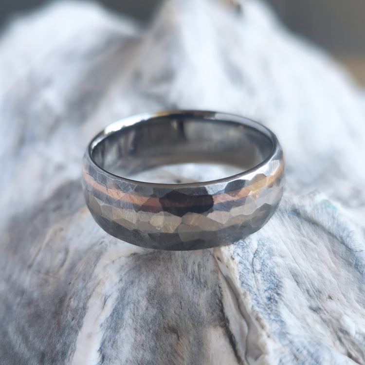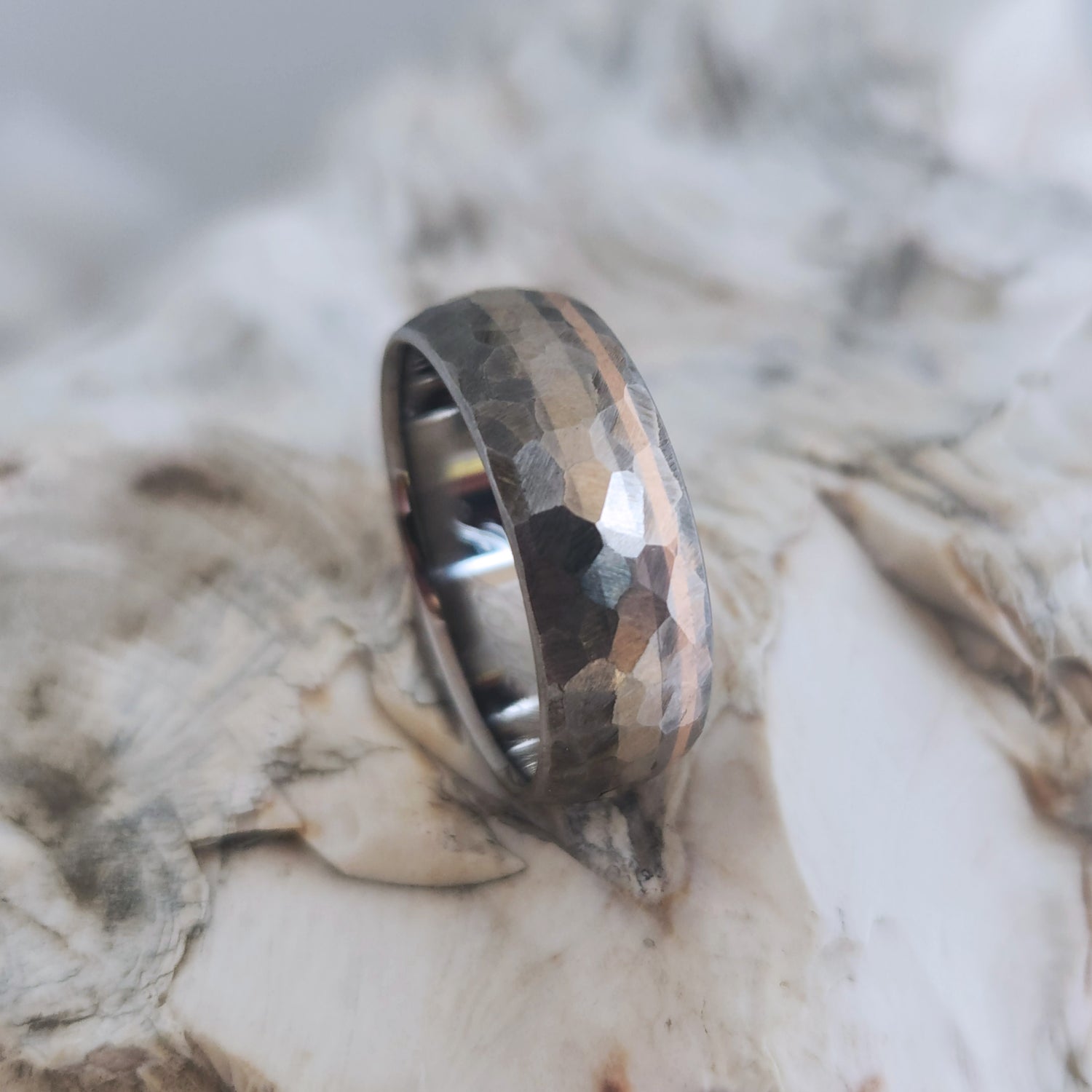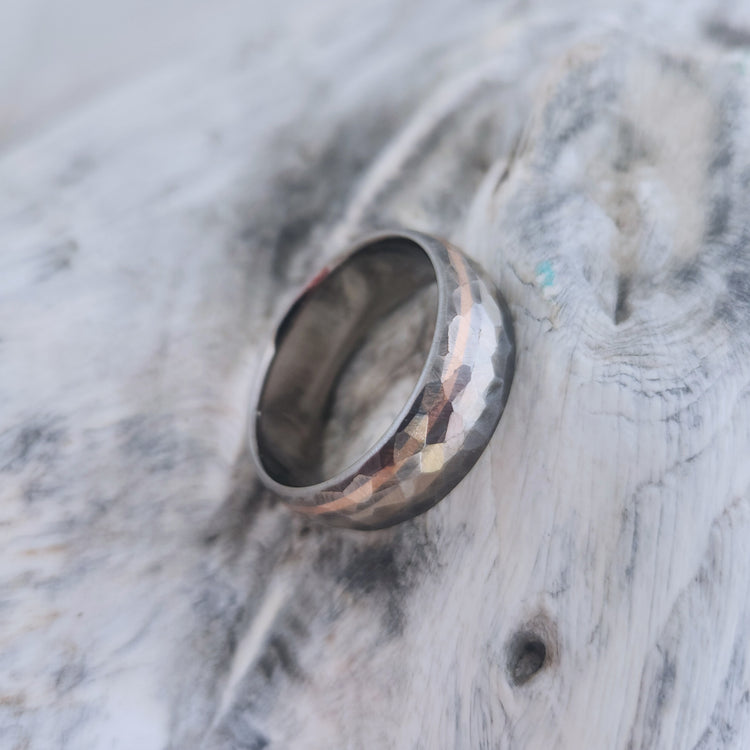 Handcrafted Titanium Ring with 18k White & Rose Gold Inlays - Unique 'Mosaic' Finish with Faceted Hammered Texture