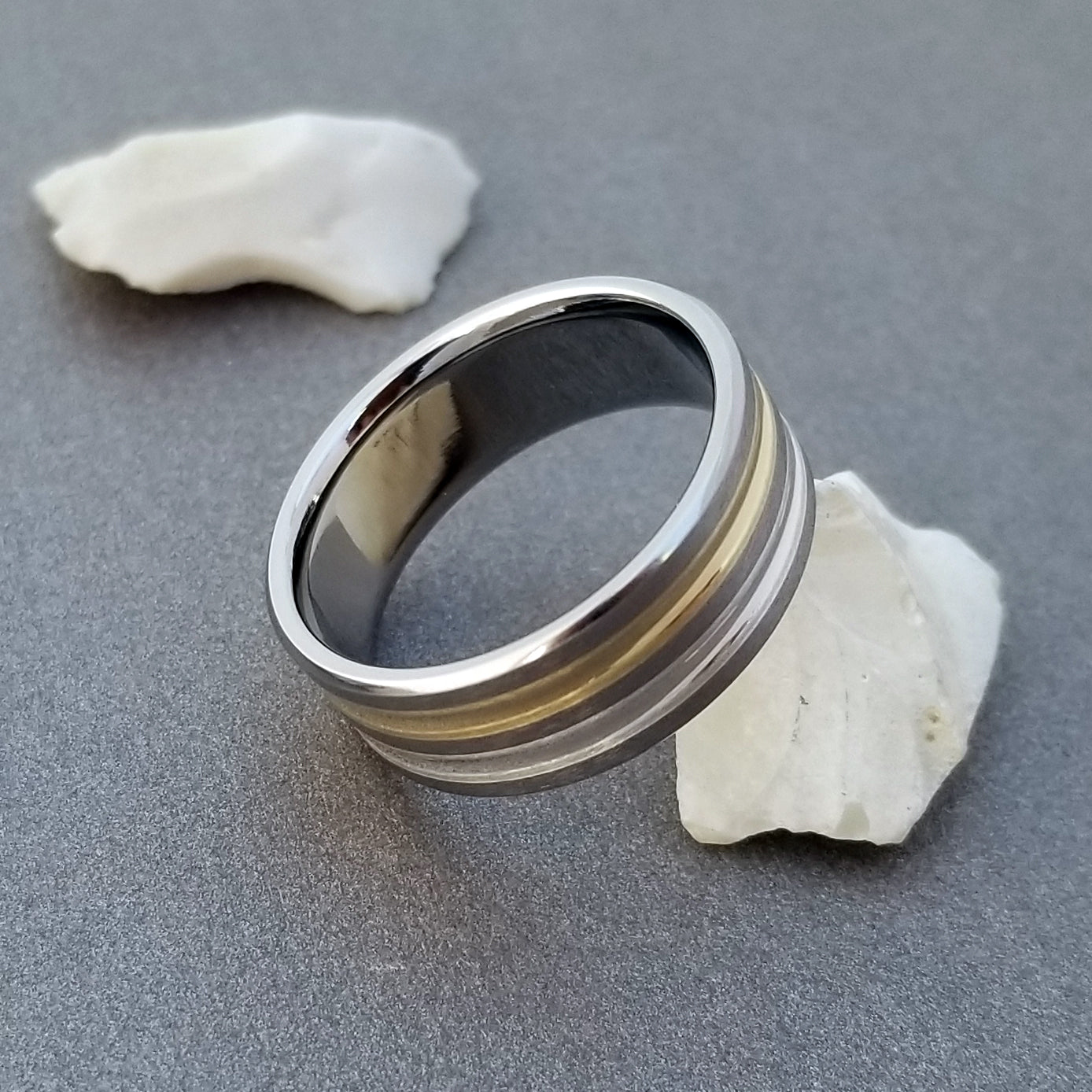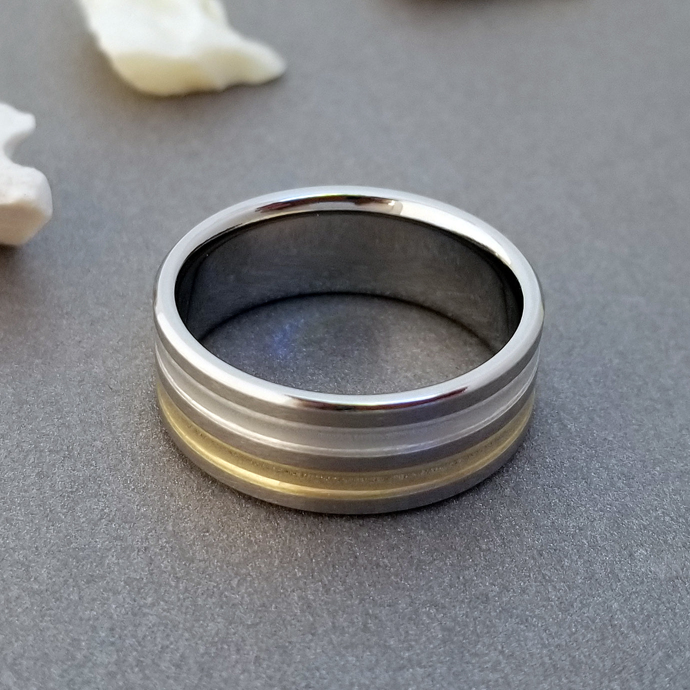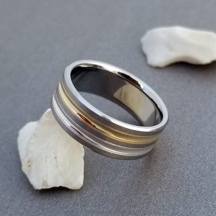 Handcrafted titanium ring with two concave Inlays of solid 18k gold and sterling silver