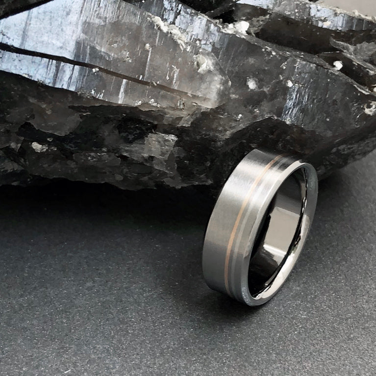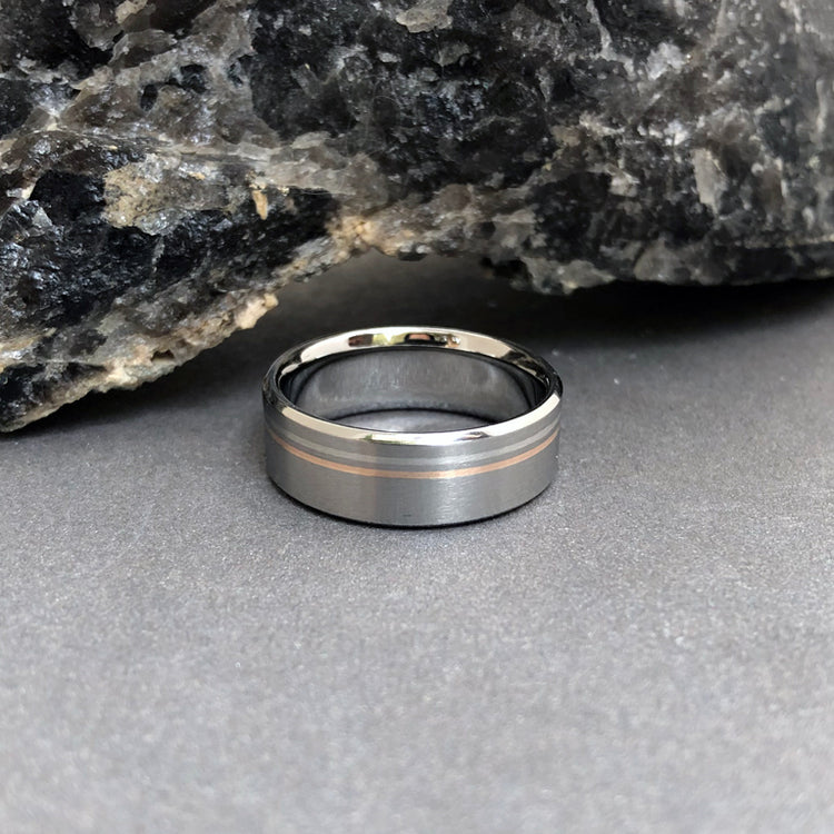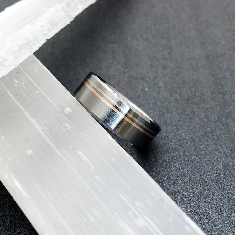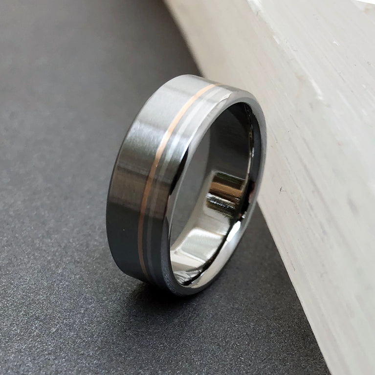 Our unique, and exclusive handmade 6al-4v aerospace grade titanium ring, with contrasting solid 18k rose gold and solid platinum inlays. A stunning mixed metal wedding or anniversary band. If preferred, the ring can be made with a solid 18k yellow gold inlay. A comfortable, durable and affordable alternative to other precious metal rings.