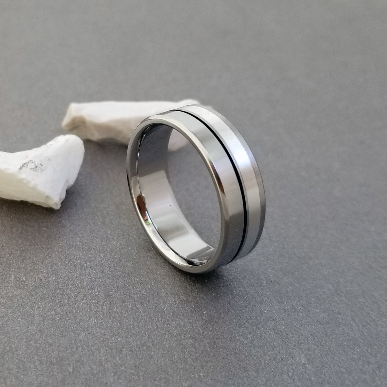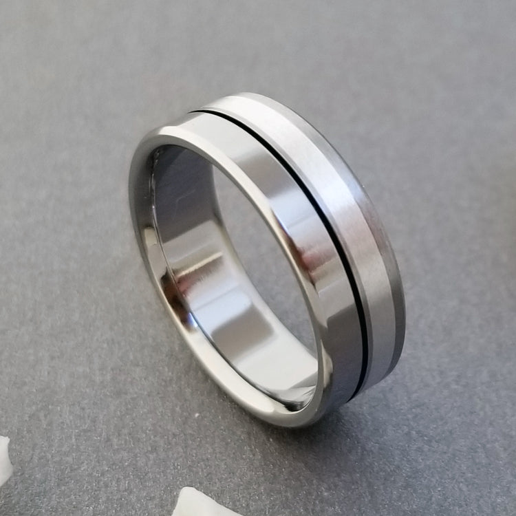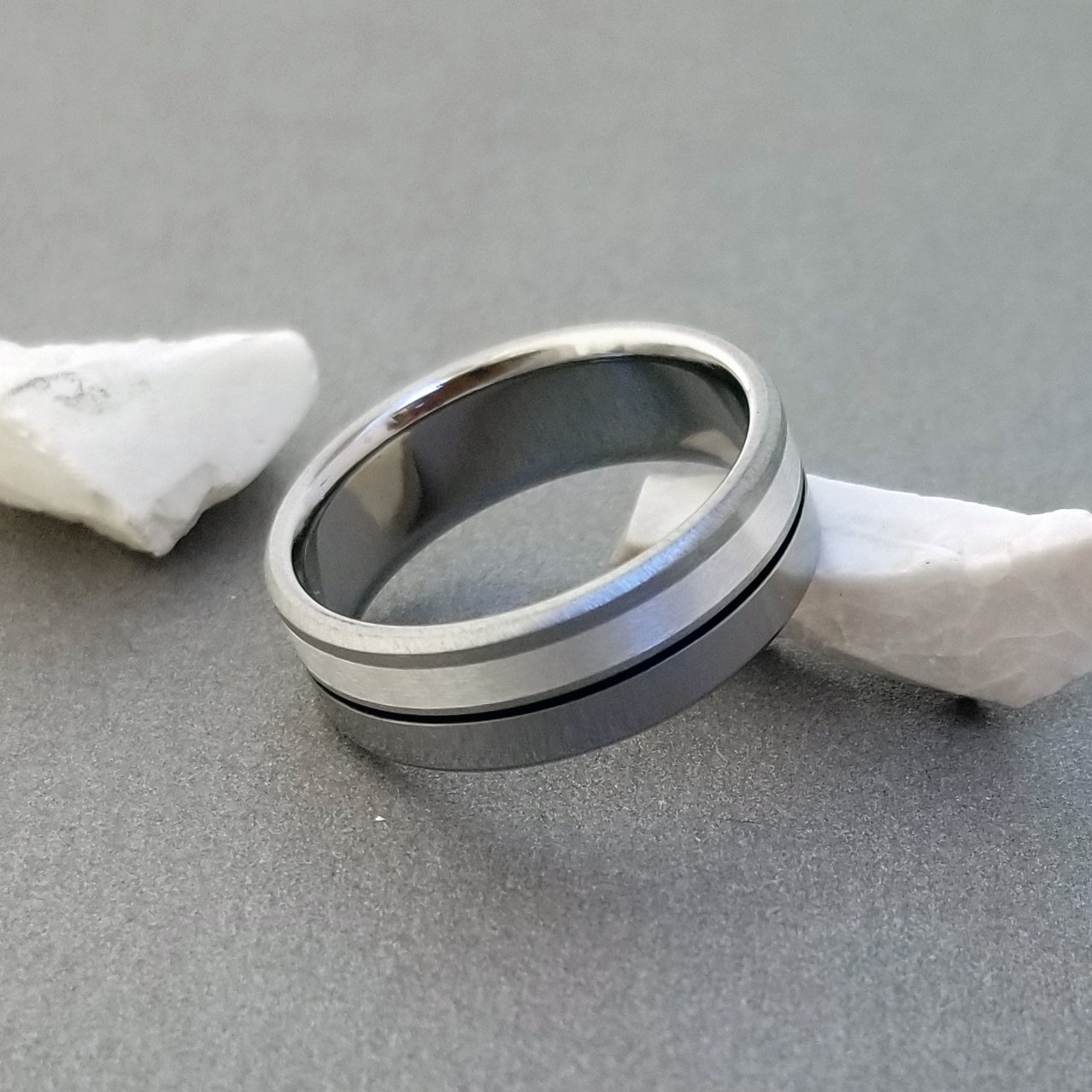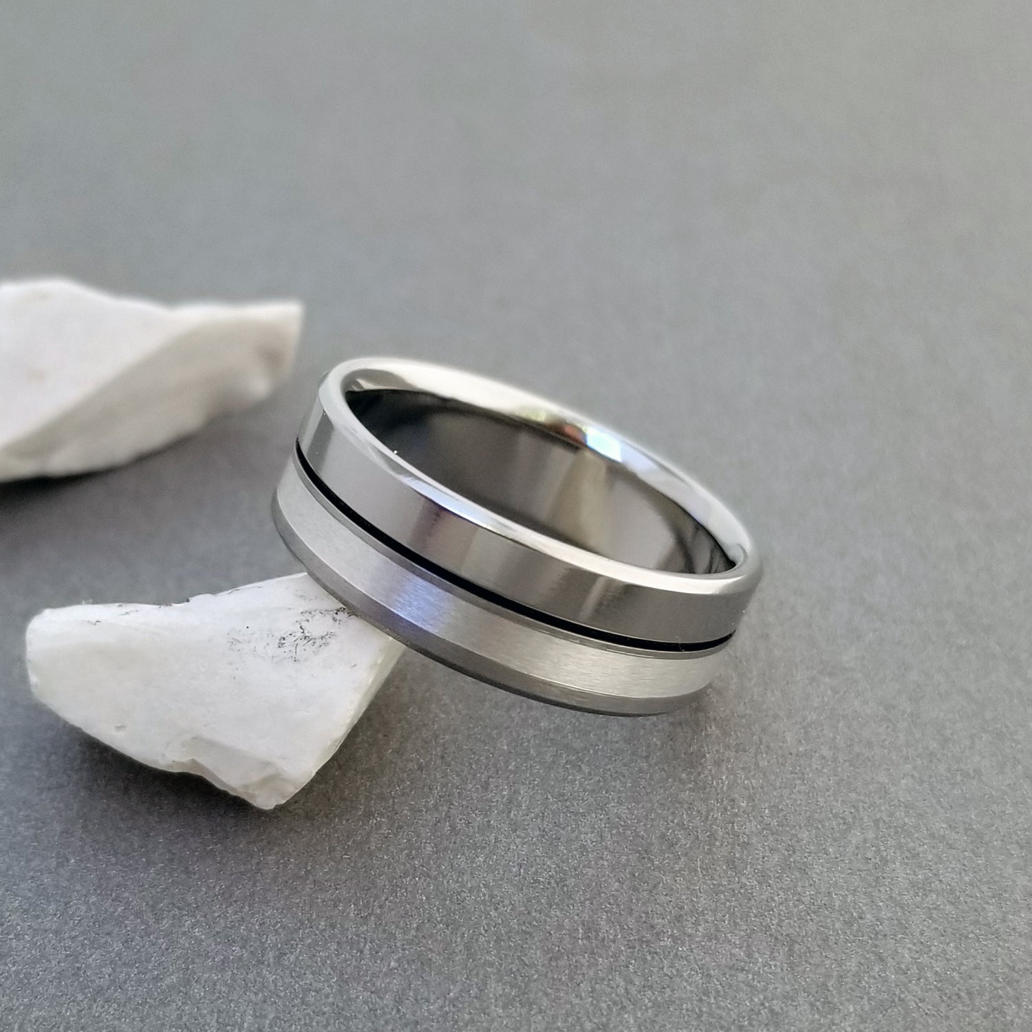 Wide solid sterling silver inlay and black pinstripe titanium ring. Ring is shown in a 7mm width, and a matte/polished finish (silver side is matte, plain side is polished).