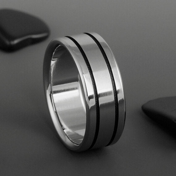 This ring has a smooth flat profile with two black pinstripes on either side. The color has a subtle texture.