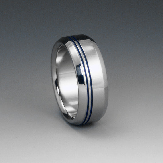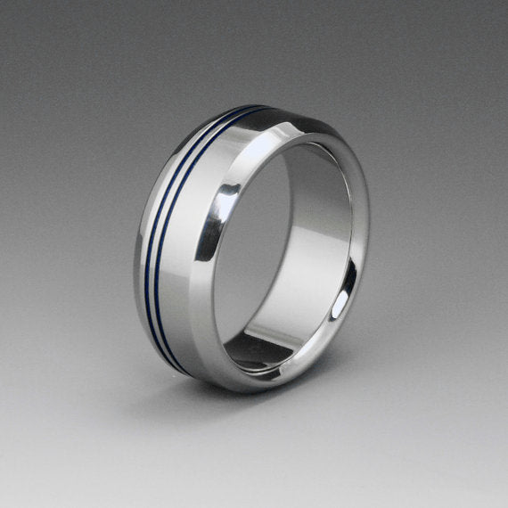 Titanium Band - Two Off Center Blue Pinstripes - Beveled Edges