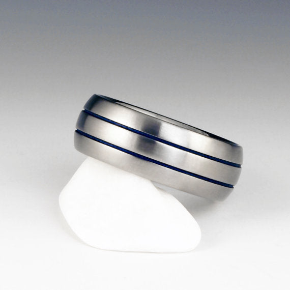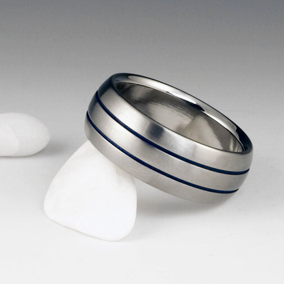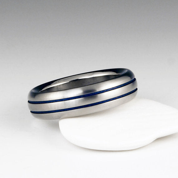 Titanium Ring - Domed Profile - Two Blue Pinstripes