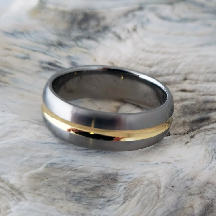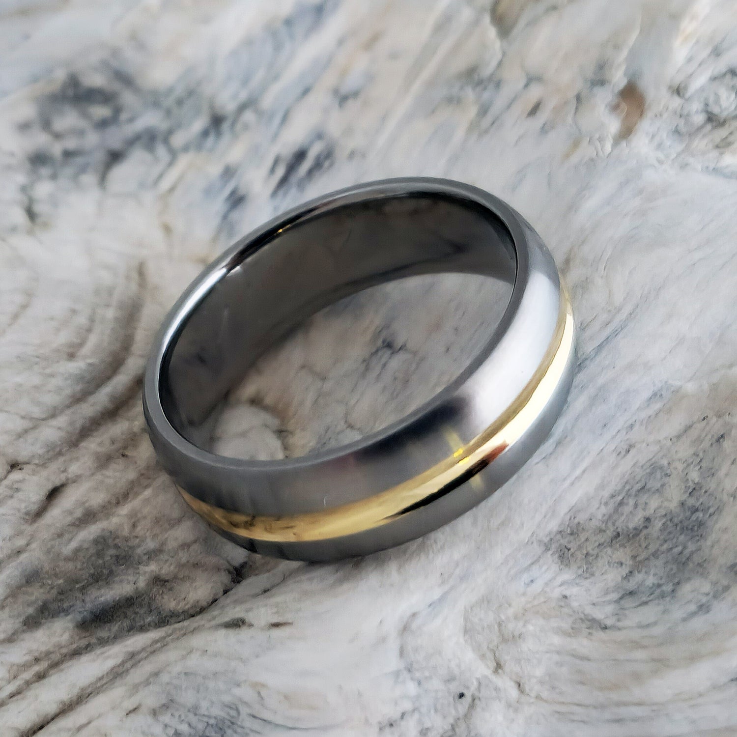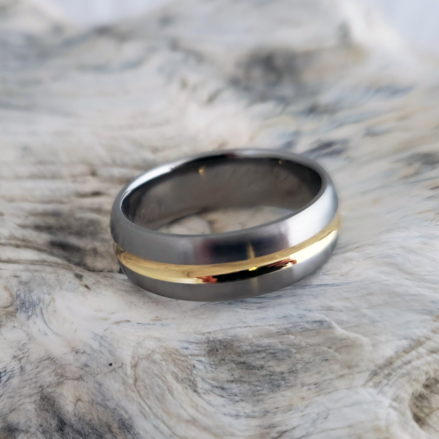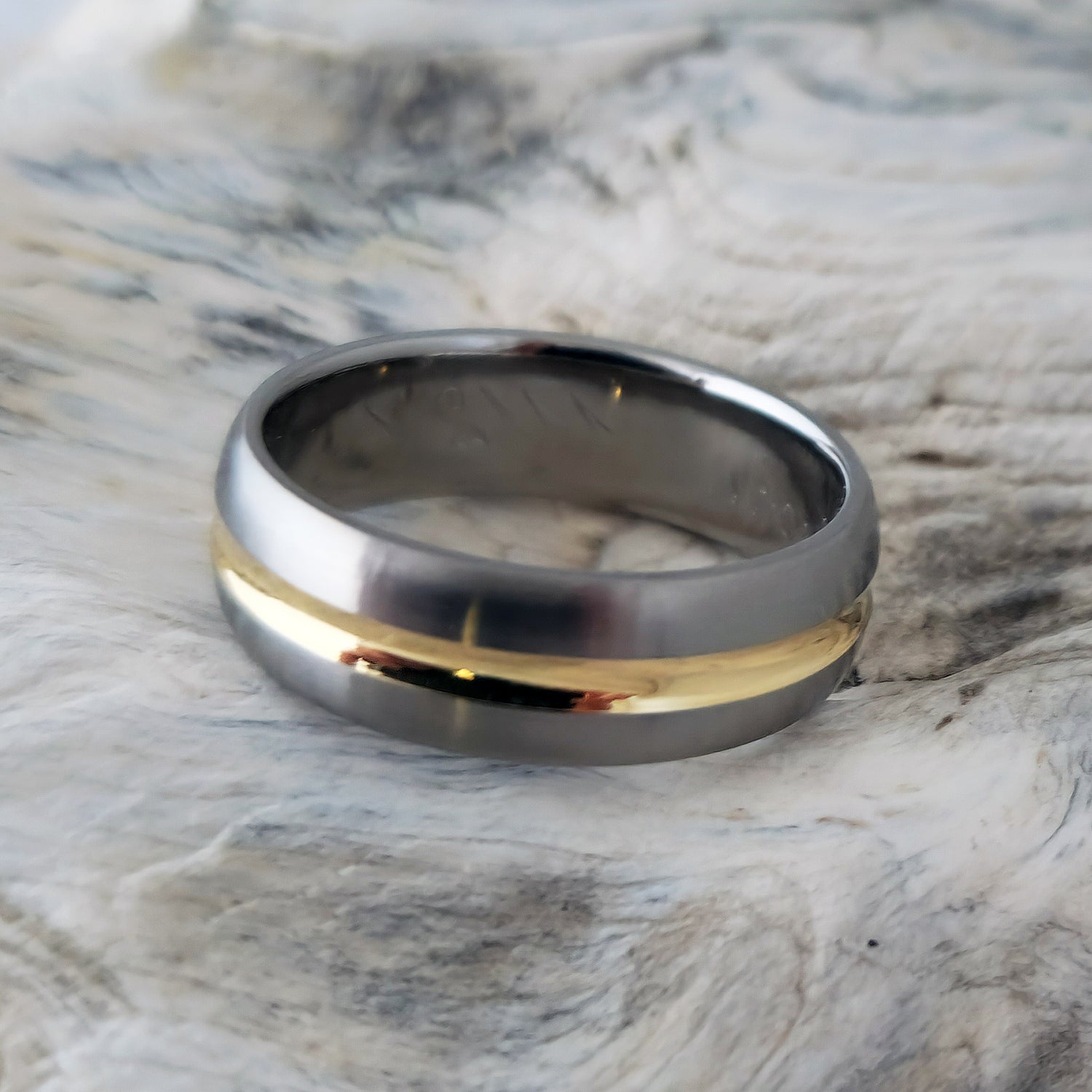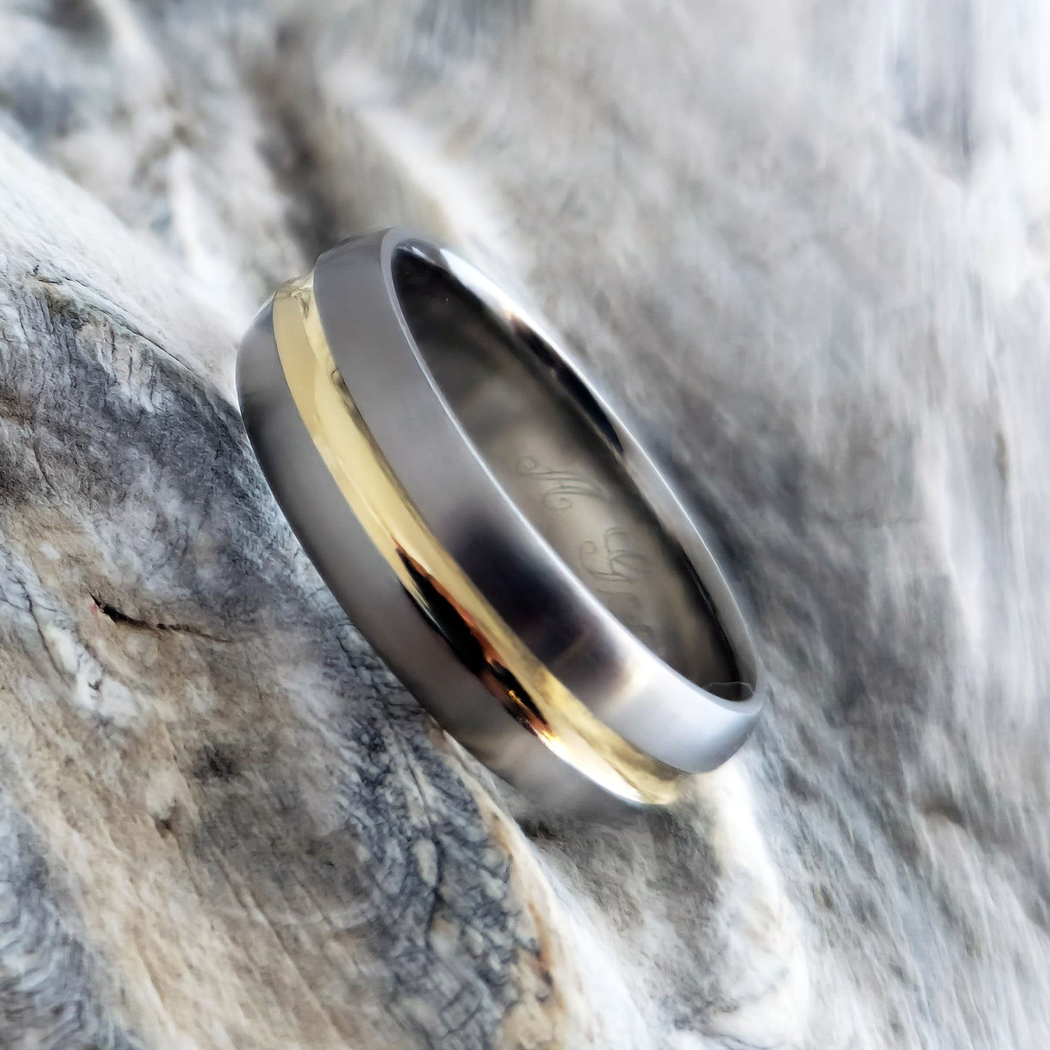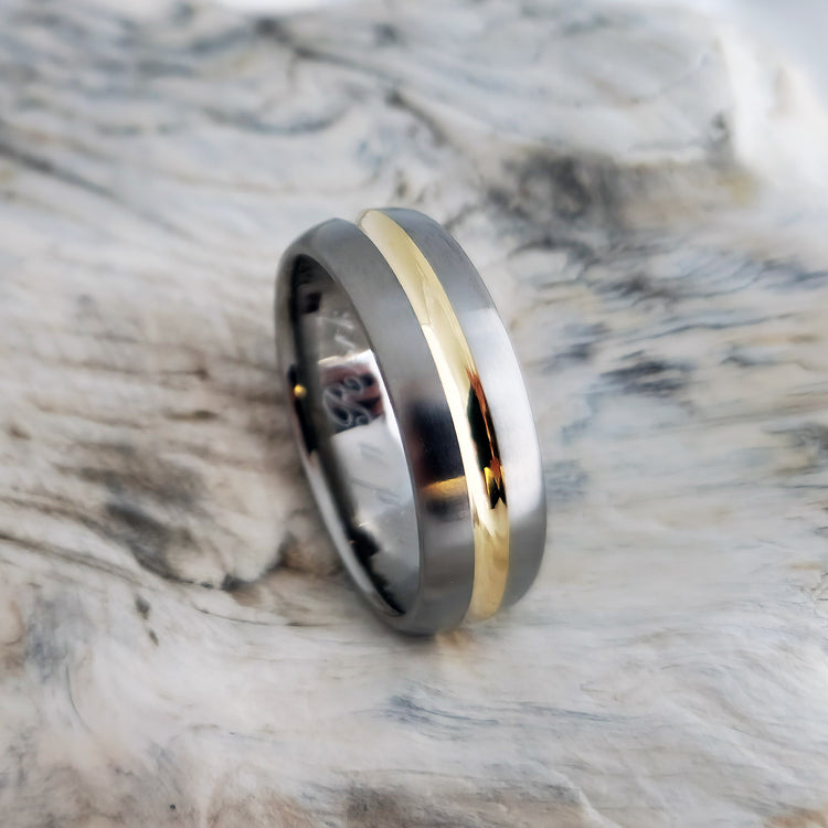Titanium Ring featuring a centered 18k solid yellow gold concave inlay. Choose between rose gold or white gold inlay for a personalized touch. Simple, elegant, and unique.
