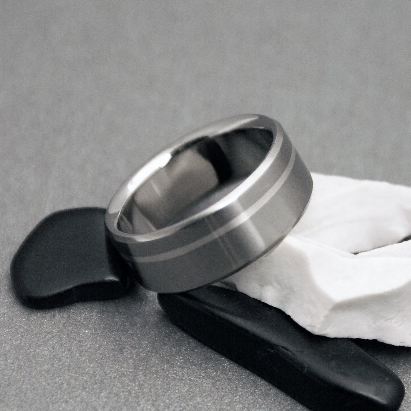 Ring is shown in an 8mm width and a satin top with polished edges.