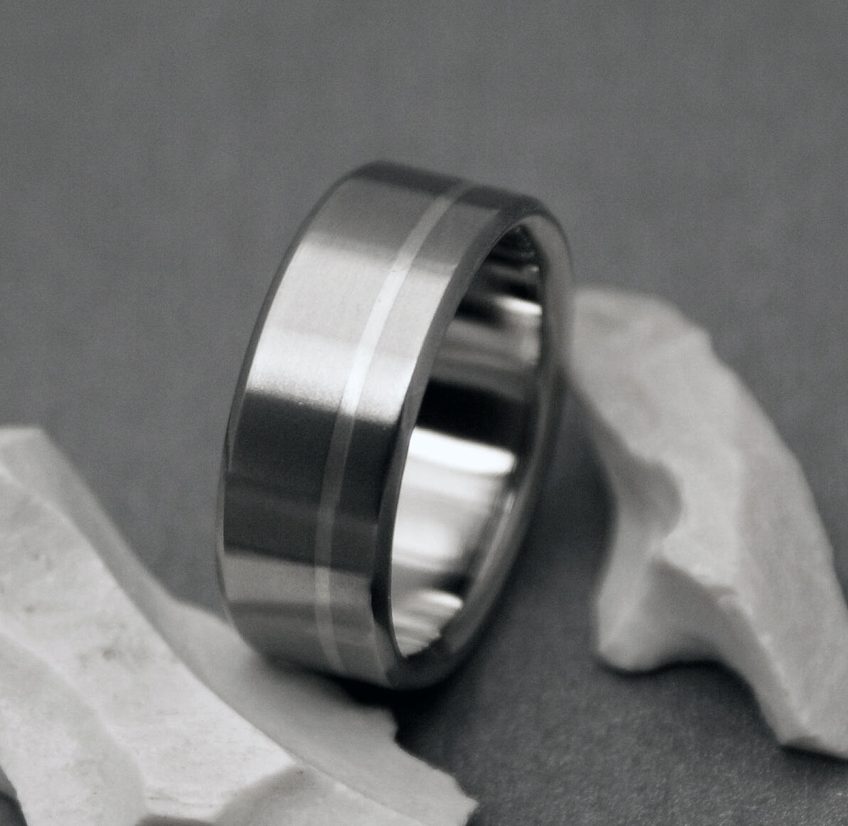 This ring has a smooth flat profile with one off center sterling silver pinstripe.