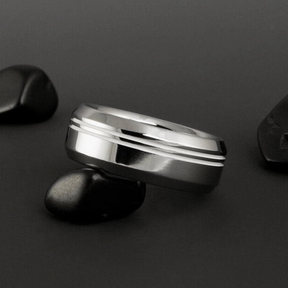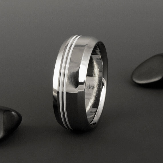 This 6AL-4V aerospace grade titanium ring showcases two off-center white pinstripes, adding a striking asymmetrical detail. The beveled edges enhance the design, creating a refined yet contemporary look. Handcrafted for durability and comfort.
