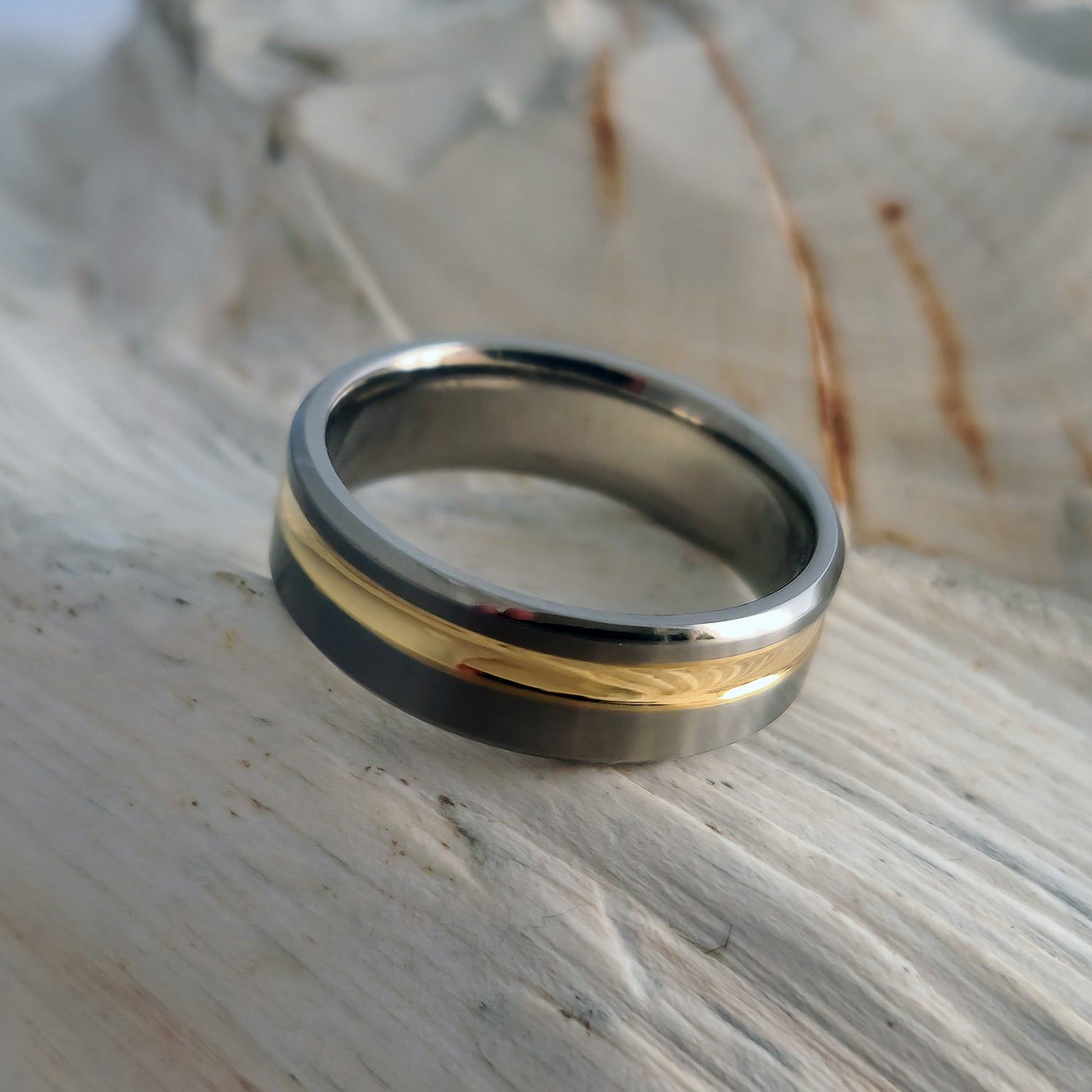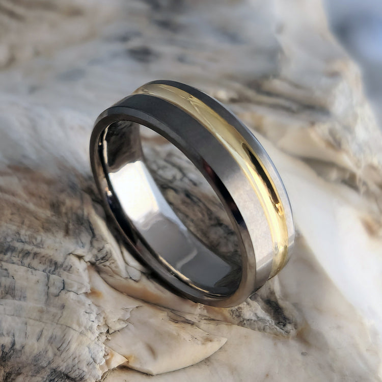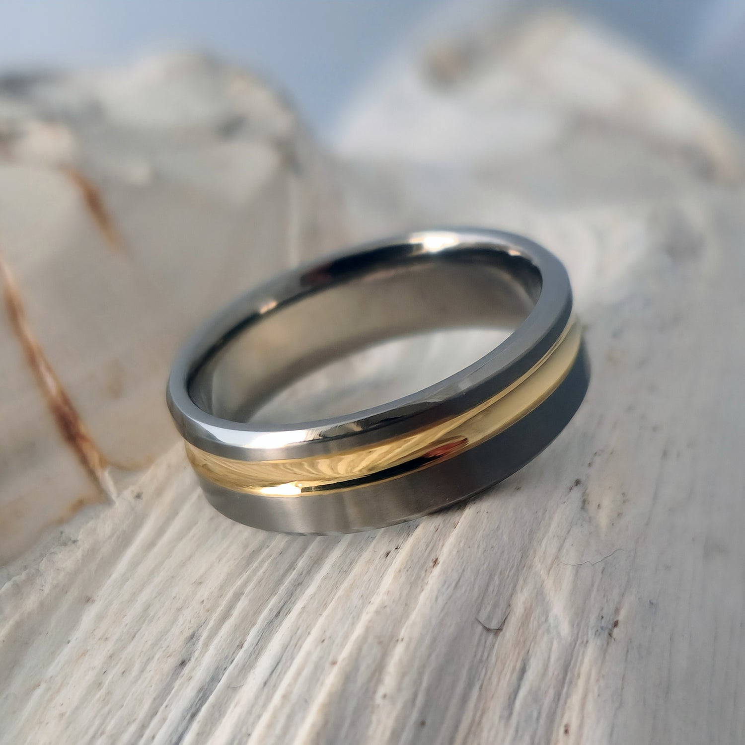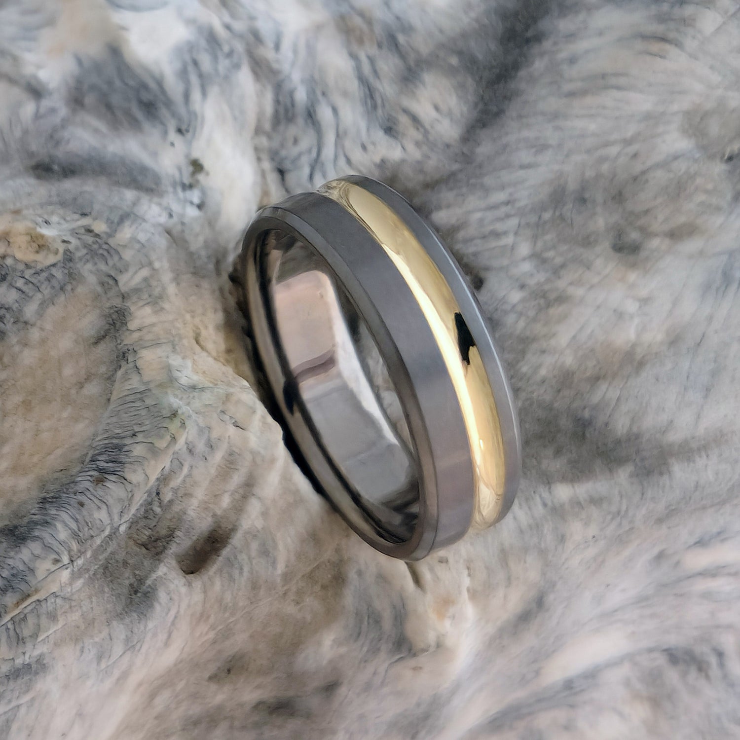 Titanium Ring featuring an off-center 18k Solid Yellow Gold Concave Inlay. Choose between rose gold or white gold inlay for a personalized touch. Simple, elegant, and unique.