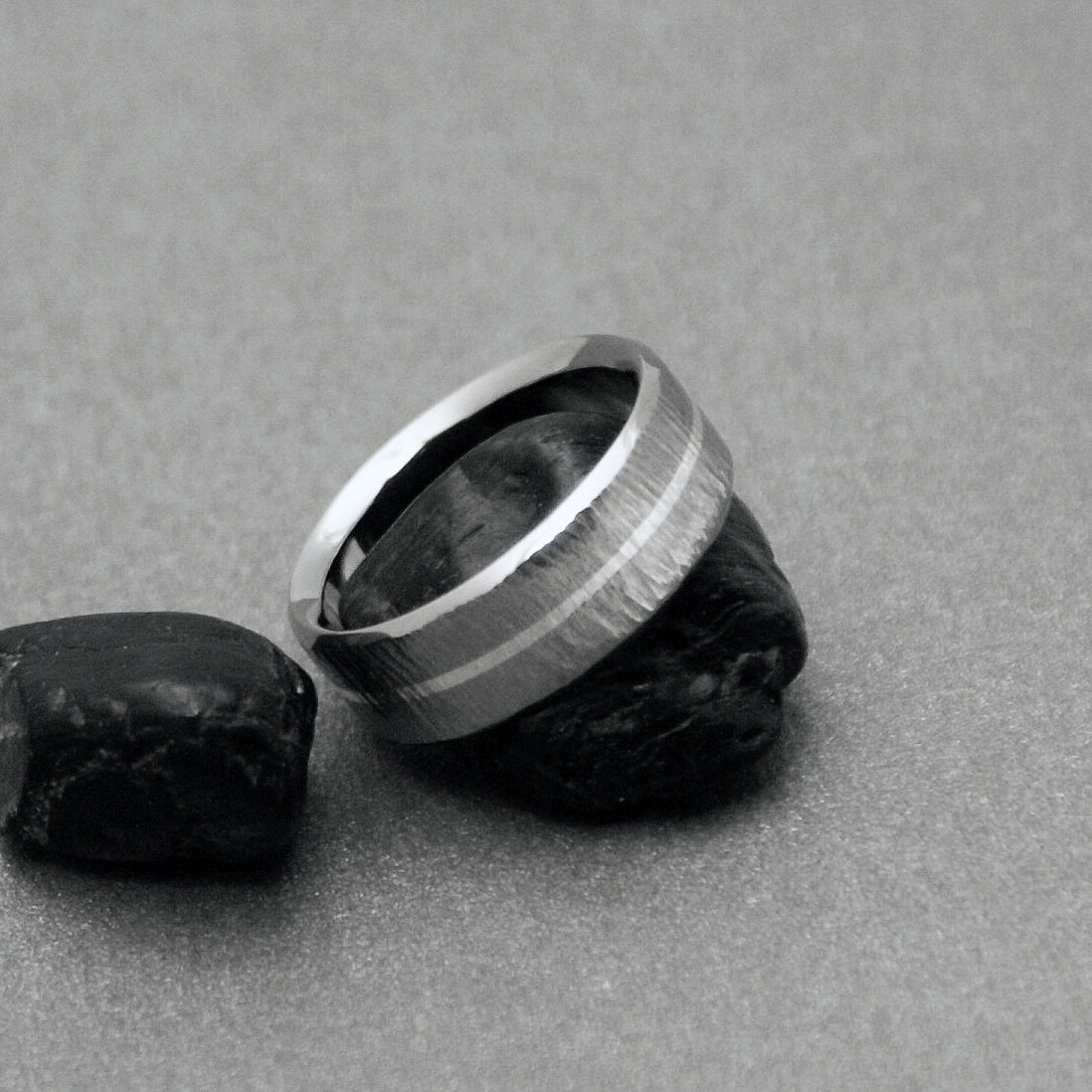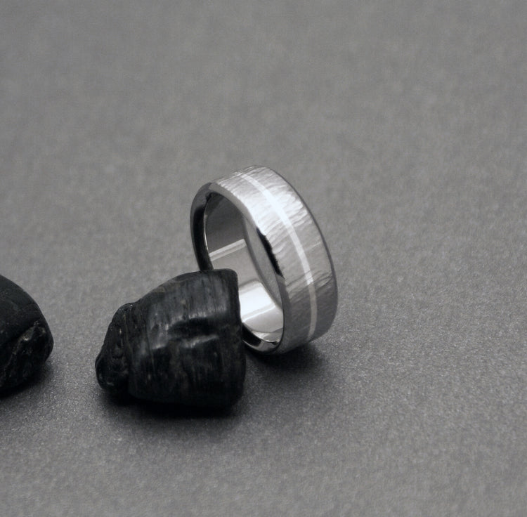 Aircraft grade titanium band with on centered sterling silver pinstripe and "wood grain" hammered finish.