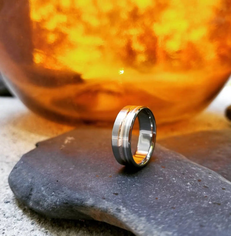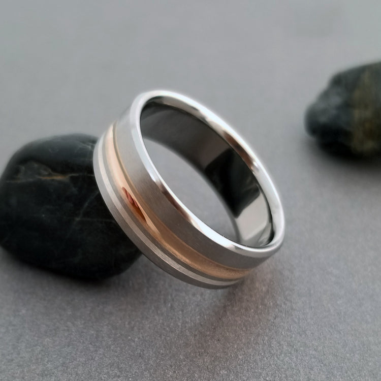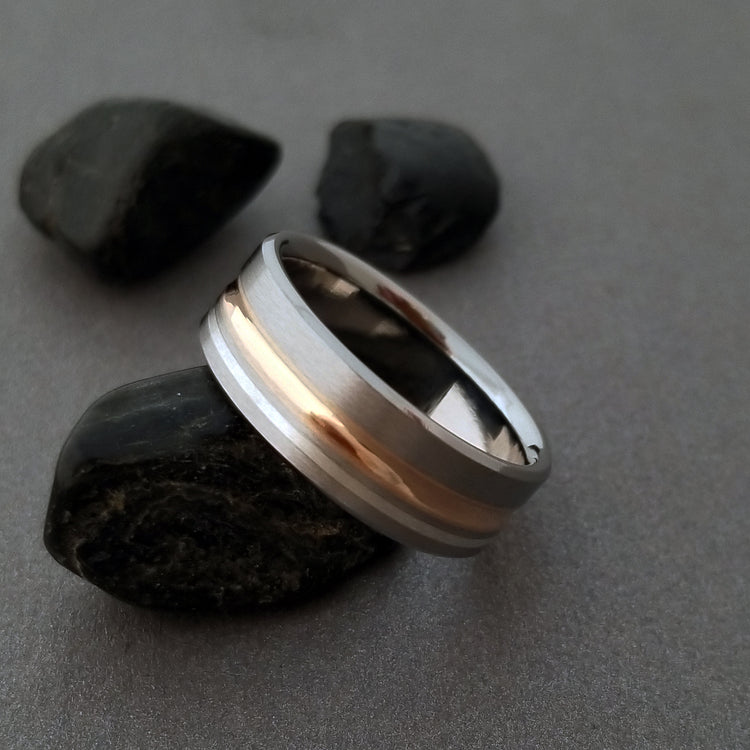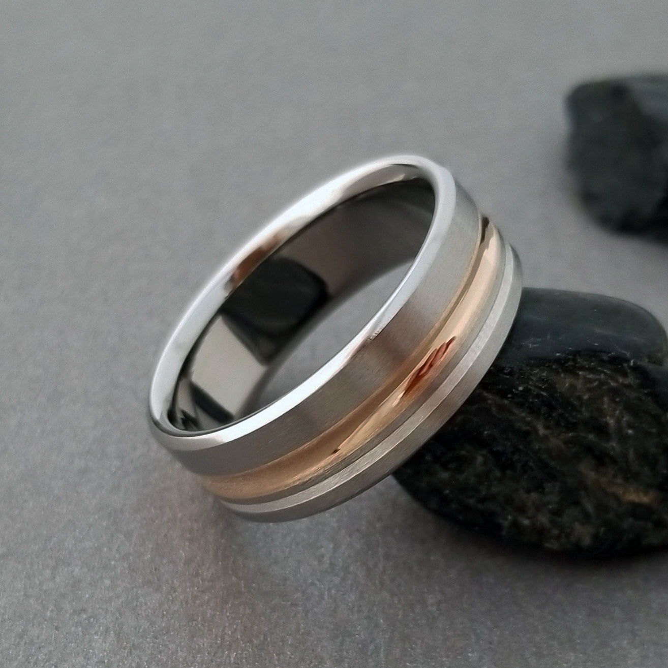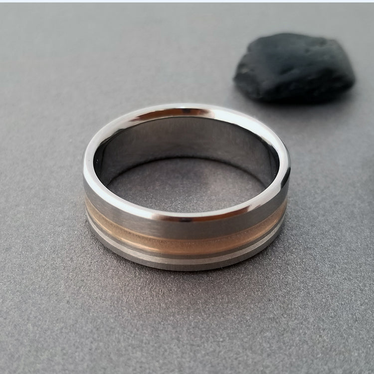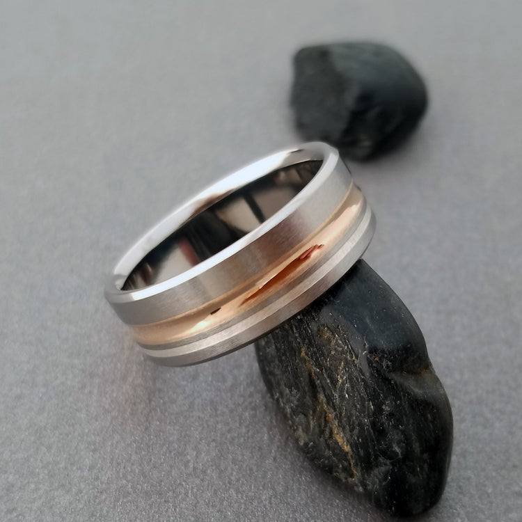 Titanium Wedding Ring with a Solid Concave Rose Gold Inlay and Sterling Silver Inlay
