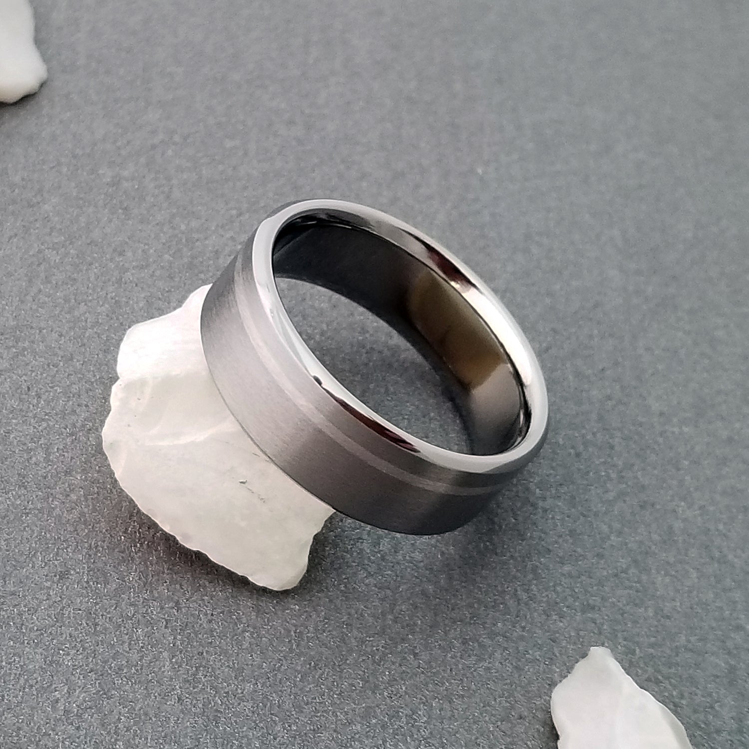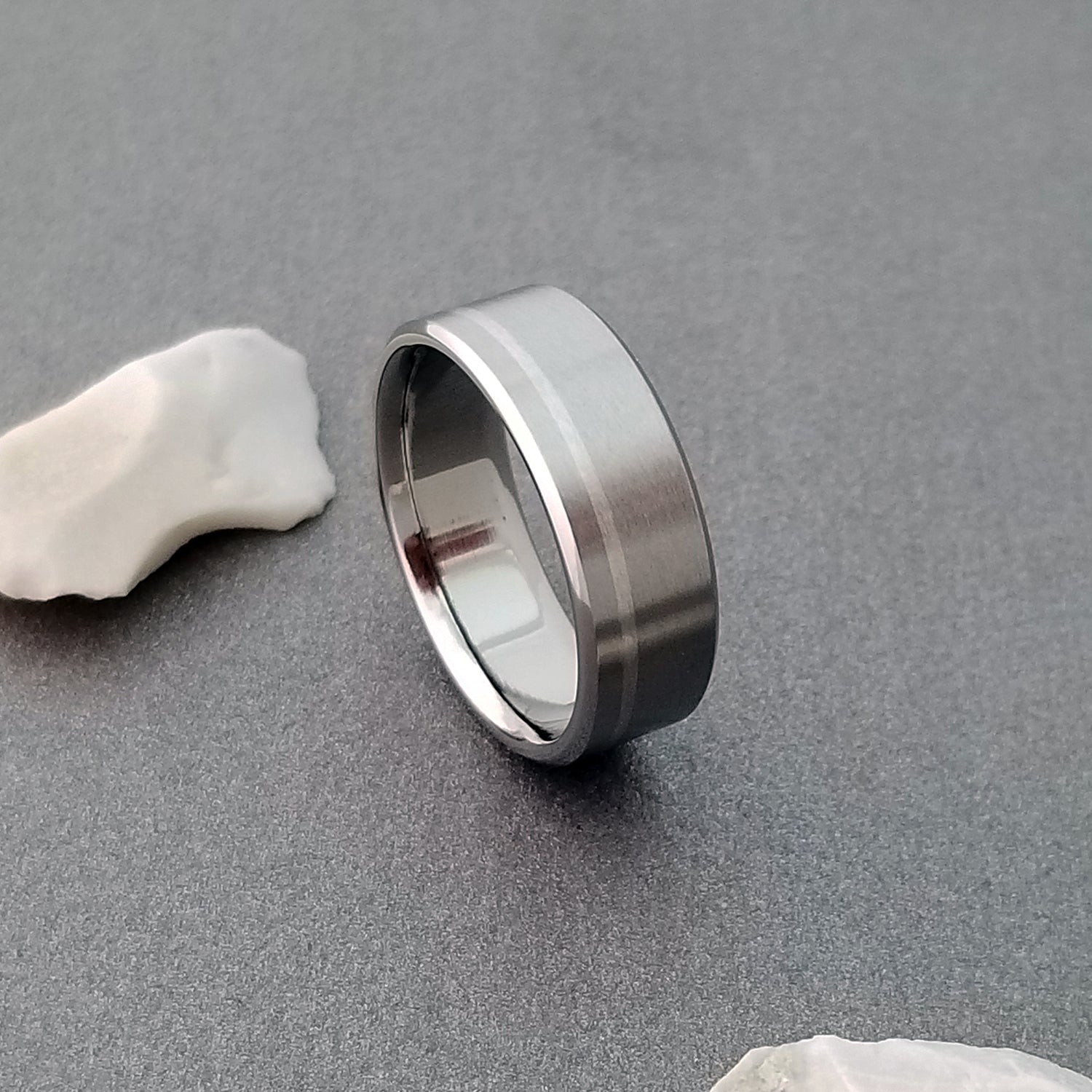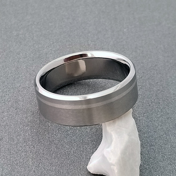 Titanium Wedding Ring with a Solid Off-Center Platinum Inlay in a Flat Profile