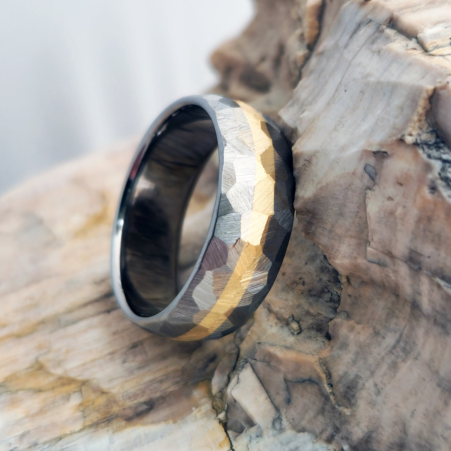 6AL-4V aerospace grade titanium wedding band featuring a domed half-round profile and a wide solid 18k yellow gold inlay. The 'Mosaic' faceted texture, hand-carved at varying angles, creates a raw, gemstone-inspired look. Each ring is unique, offering lasting comfort and durability. Available with your choice of 18k yellow, rose, or white gold inlays for a custom touch.