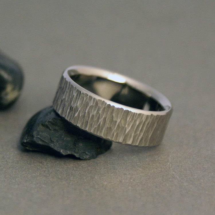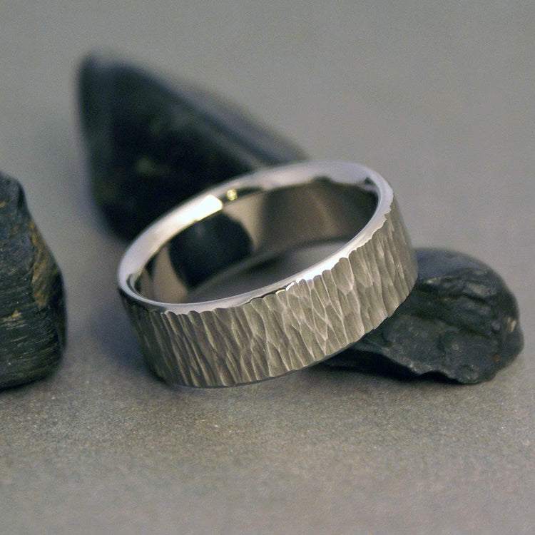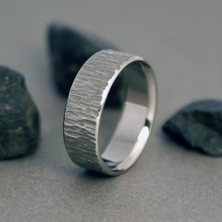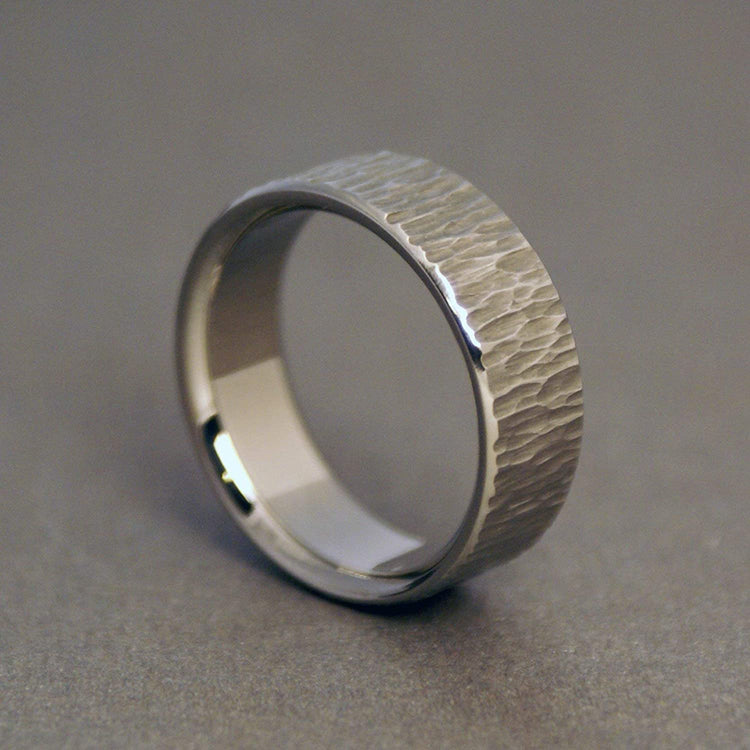 6AL-4V aerospace grade 5 titanium wedding band with our original 'White Ash Tree' hand-carved wood grain/tree bark texture in a flat profile. This band features a rustic, nature-inspired design and is incredibly comfortable and durable for everyday wear.