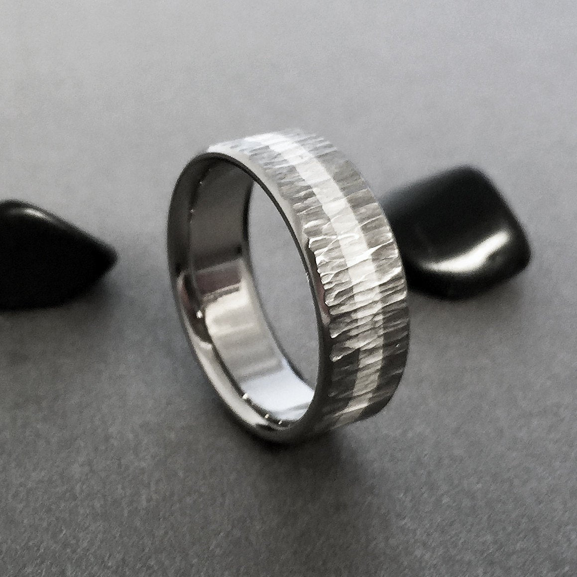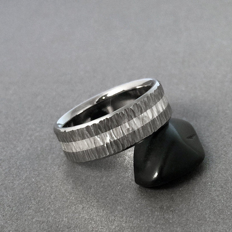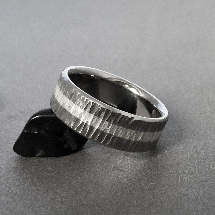 Titanium Ring with our 'White Ash Tree' Tree Bark / Wood Grain Texture and a Centered Wide Solid Sterling Silver Inlay
