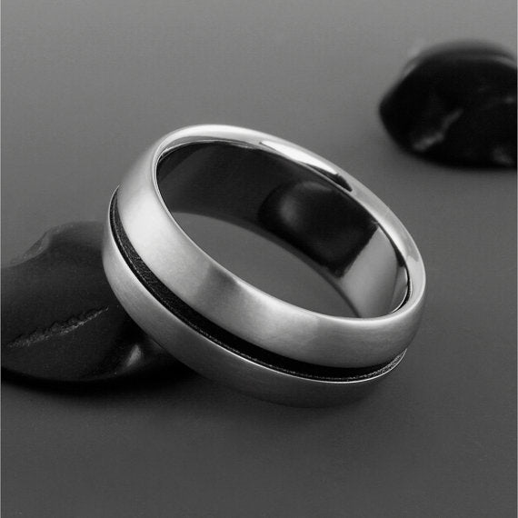 This ring has a domed profile with one centered wide black pinstripe. The color has a subtle texture.