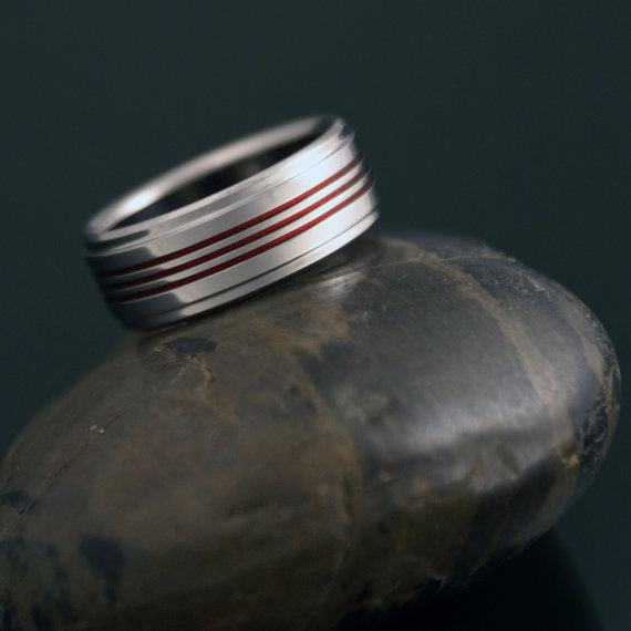Titanium Band - Three Centered Red Pinstripes - Stepped Down Edges