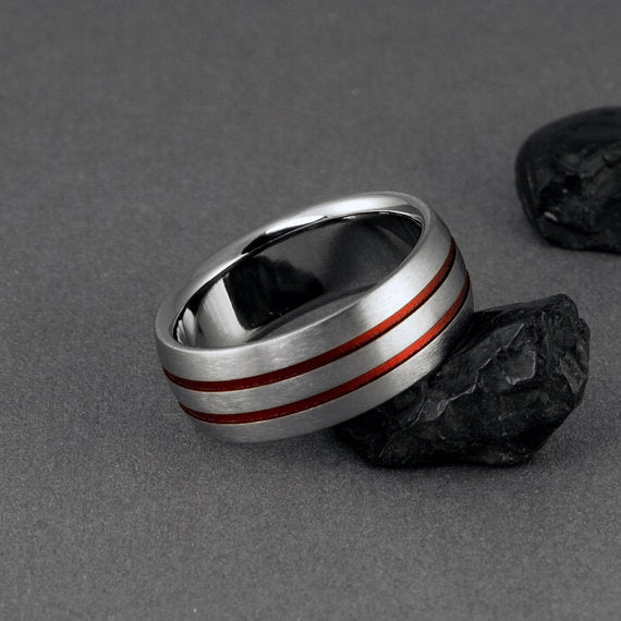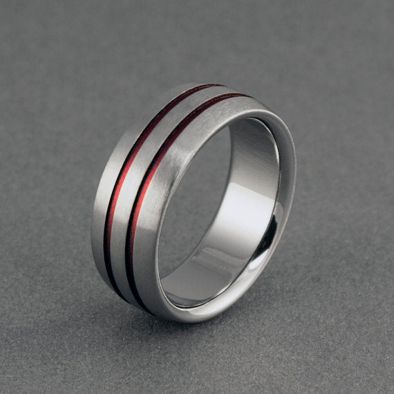 Titanium Ring - Flat Top - Beveled Edges - Two Centered Red Pinstripes