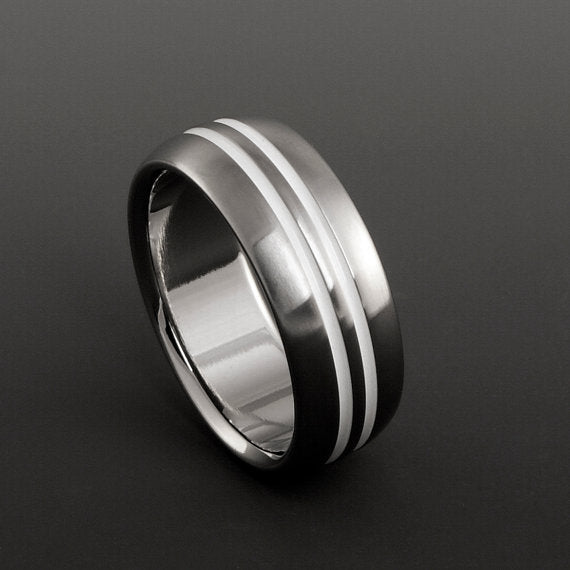 Titanium Ring in a Domed Profile with Twin Centered White Centered Pinstripes
