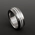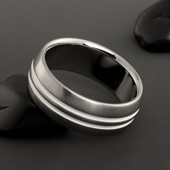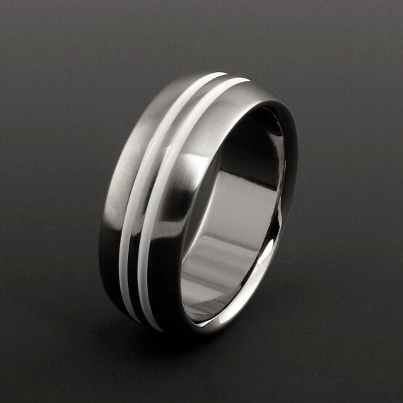 Expertly made to order, this 6AL-4V aerospace grade titanium ring features a domed profile with twin white pinstripes through the center. A timeless design with a handcrafted touch.