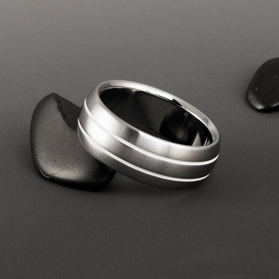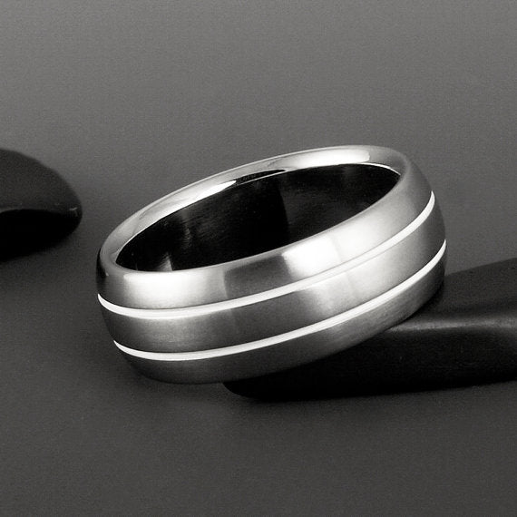 Titanium Ring with a Domed Profile and Two Equally Spaced Narrow White Pinstripes