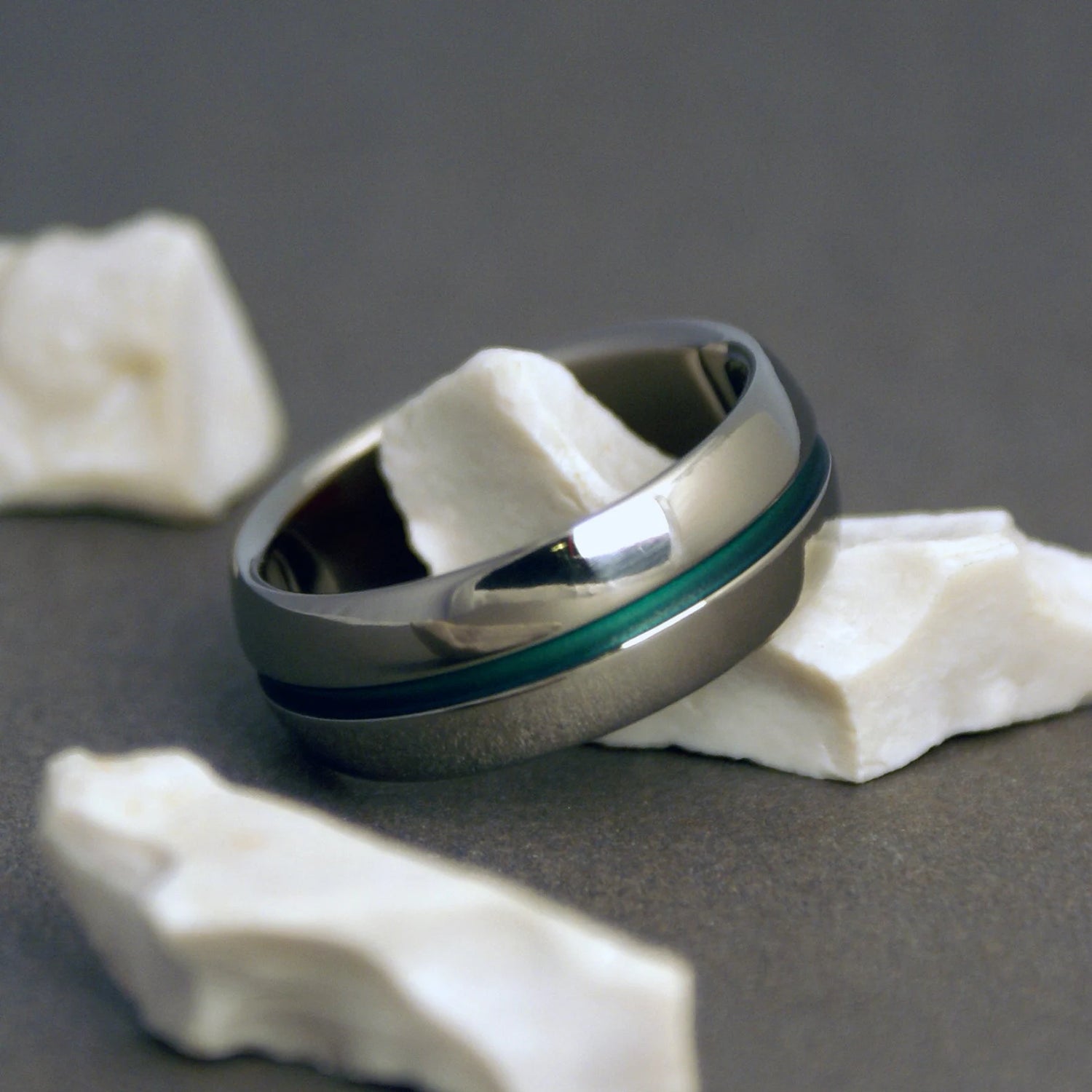 Titanium Band in a Domed Profile and an Emerald Green Centered Pinstripe