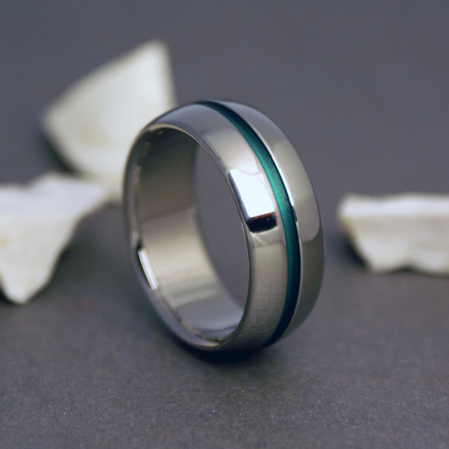 This hand crafted titanium band features a brilliant emerald green stripe set into a smooth domed profile. Our rings are all handmade from the finest materials. Guaranteeing that your wedding ring or engagement band will last forever. As always, we are happy to offer free engraving.
