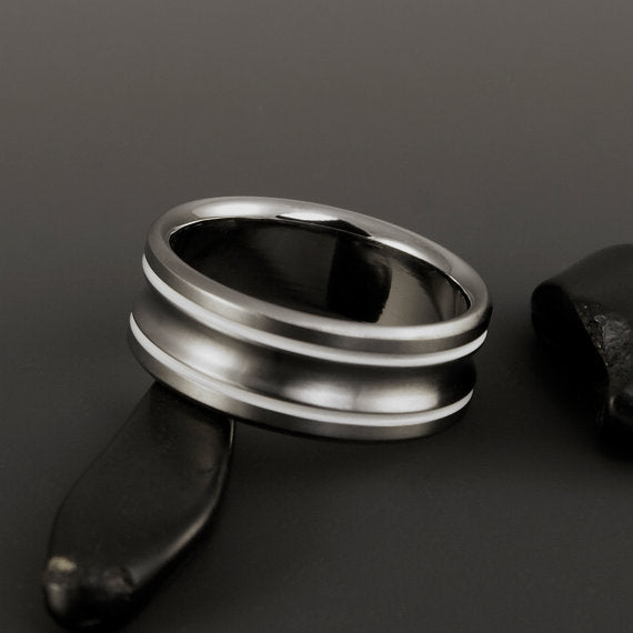 Titanium Ring with two White Pinstripe Inlays and a Concave Center